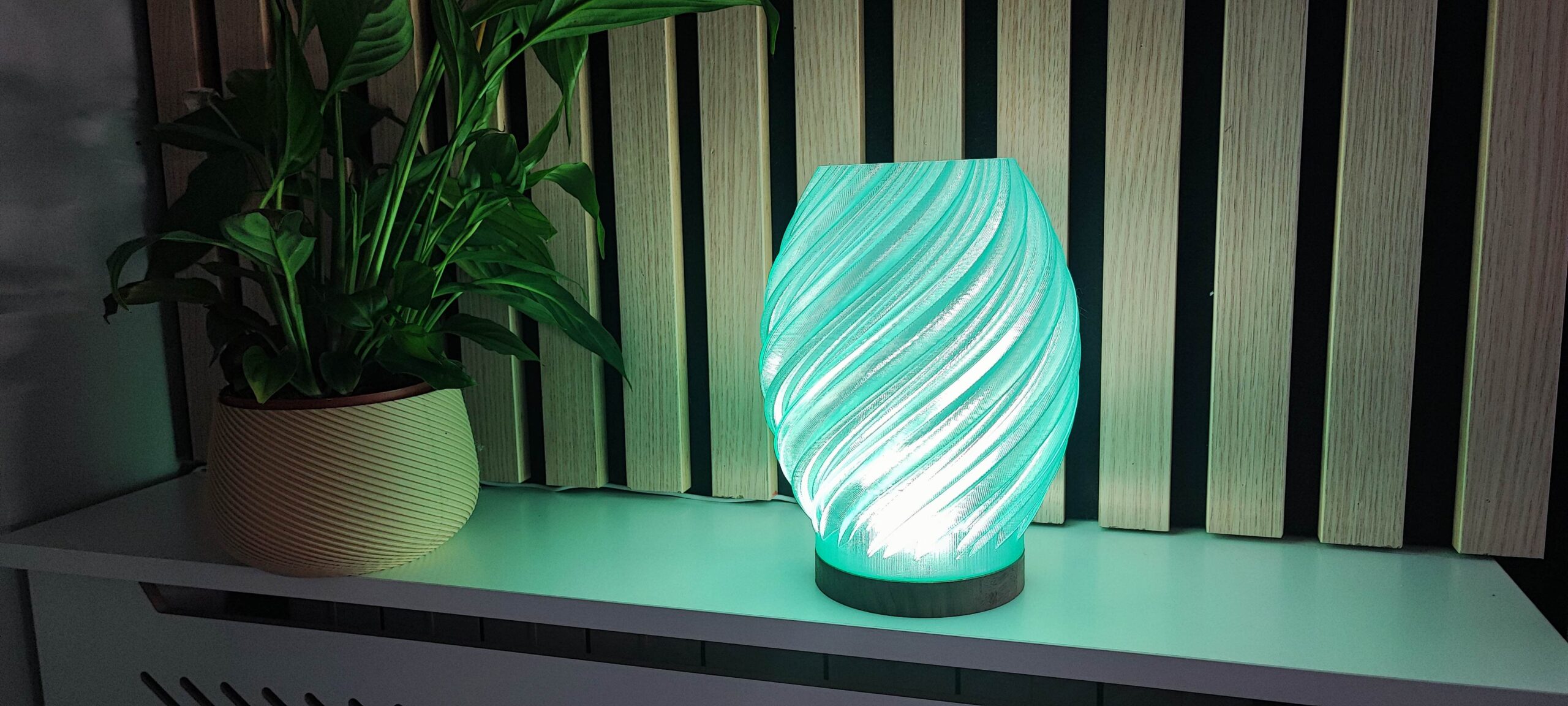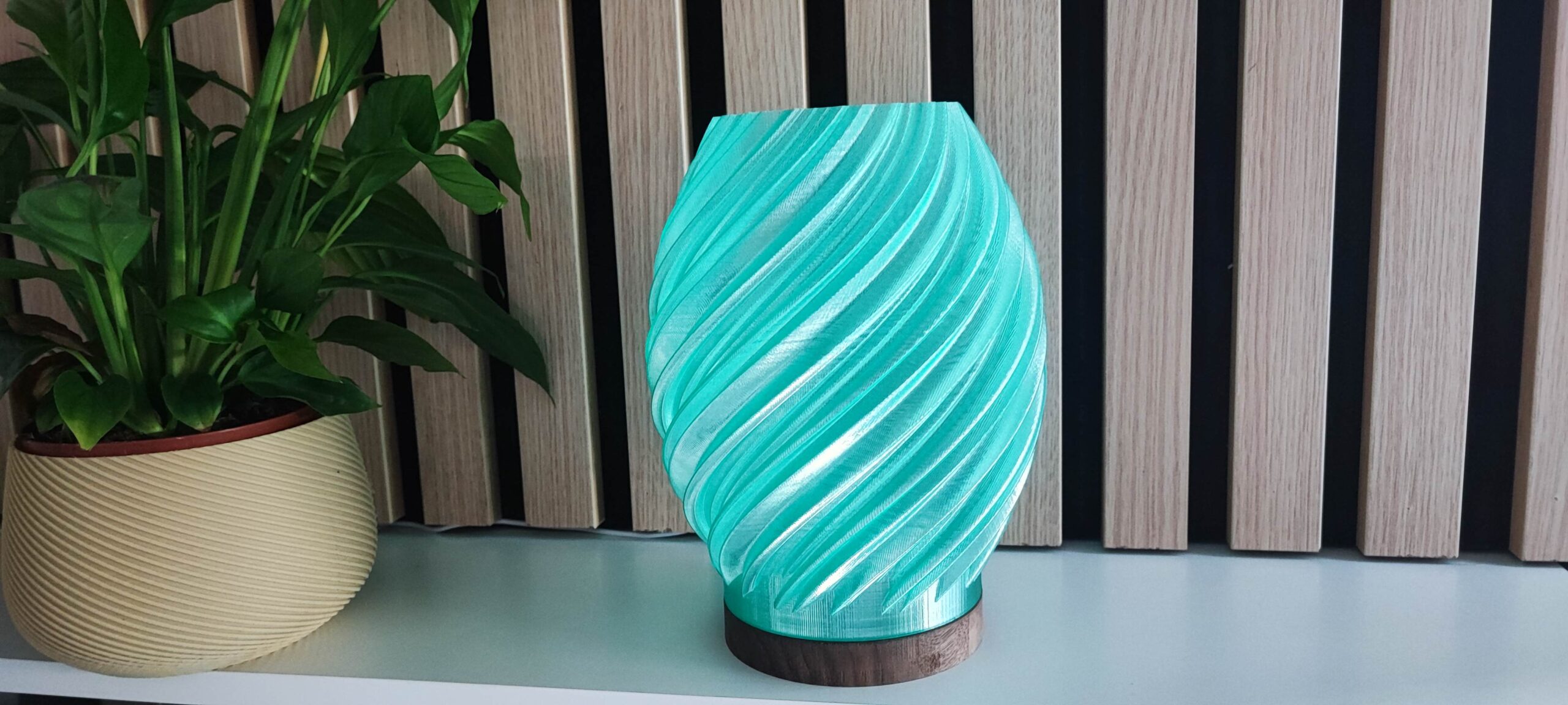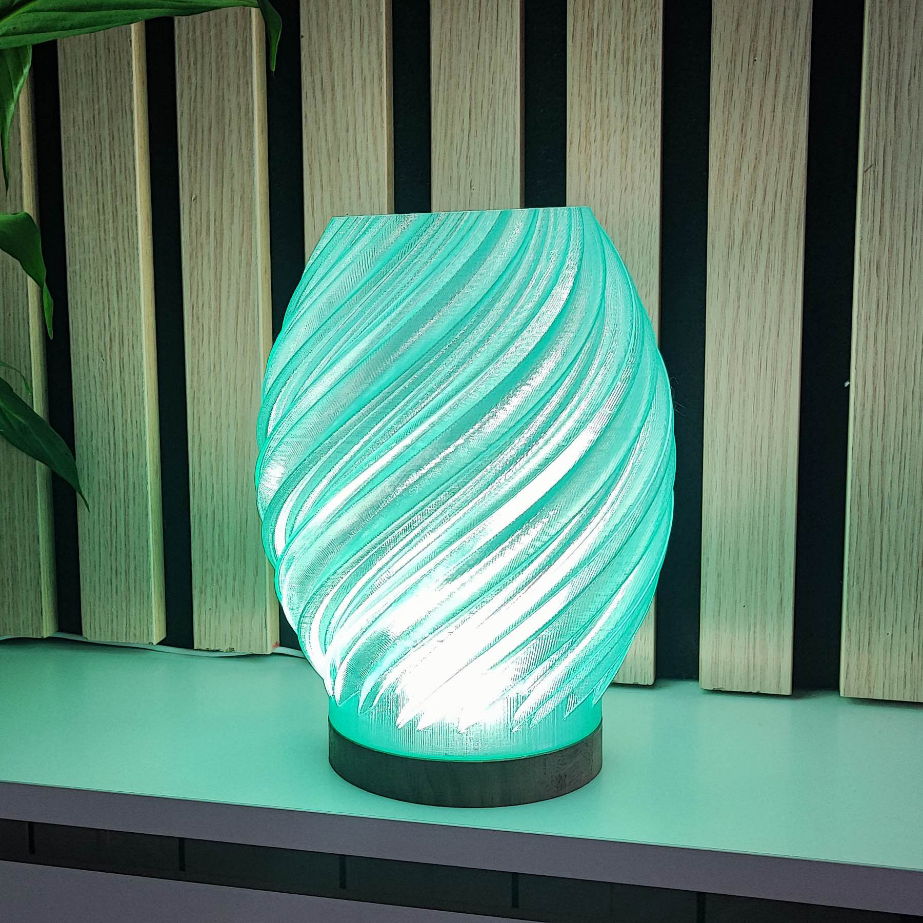 Lámpara led de mesa con un diseño en espiral de color verde, creando un ambiente acogedor y elegante. Creada en impresión 3D y madera de nogal, mezcla de forma elegante las ultimas tecnologias con los materiales mas clasicos